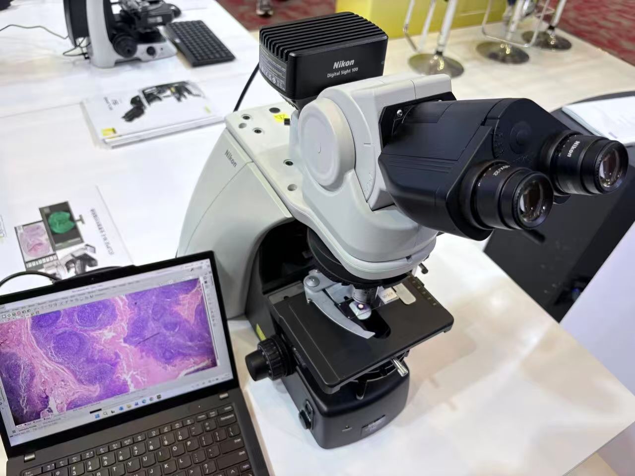 本次展会还特意展出尼康最新品相机——Digital Sight 100,该相机完美适配各类光学显微镜,专为病理、科研及教学场景打造。